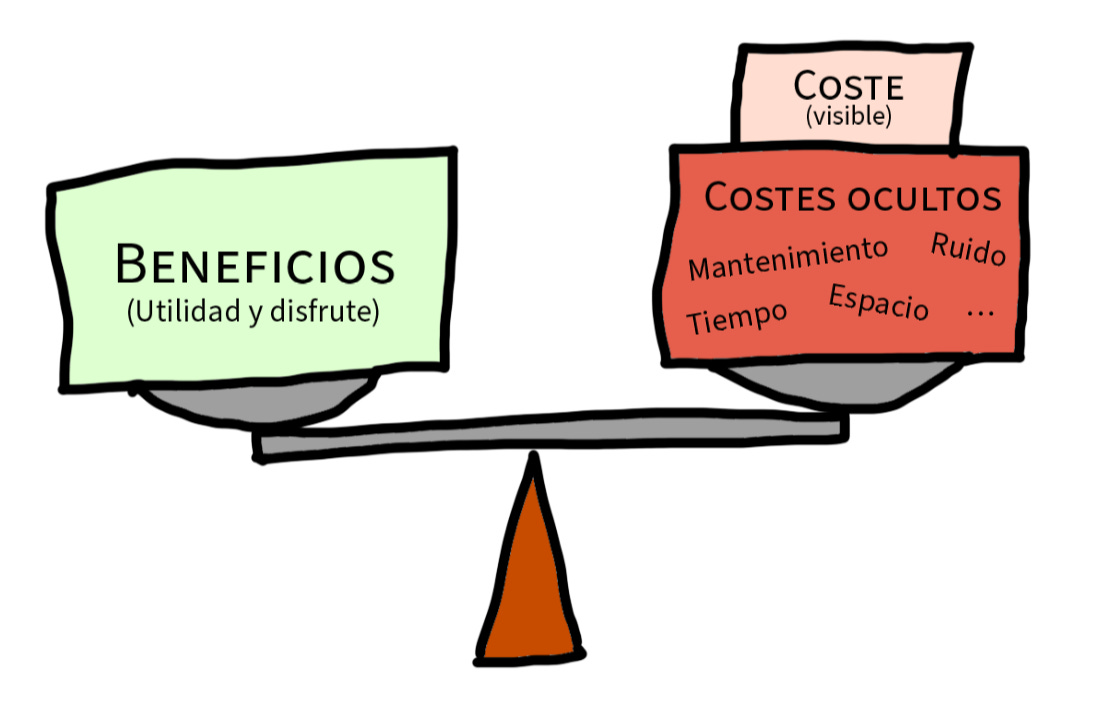 Para mí, el valor real, implica que el valor que aporta el objeto supera a los costes. Y para hacer este cálculo, es muy importante tener en cuenta los costes ocultos. El precio del producto como tal es solo el coste superficial, pero todo objeto requiere más cosas de nosotros. Almacenarlo, arreglarlo, pintarlo, limpiarlo, moverlo, cargarlo, etc.