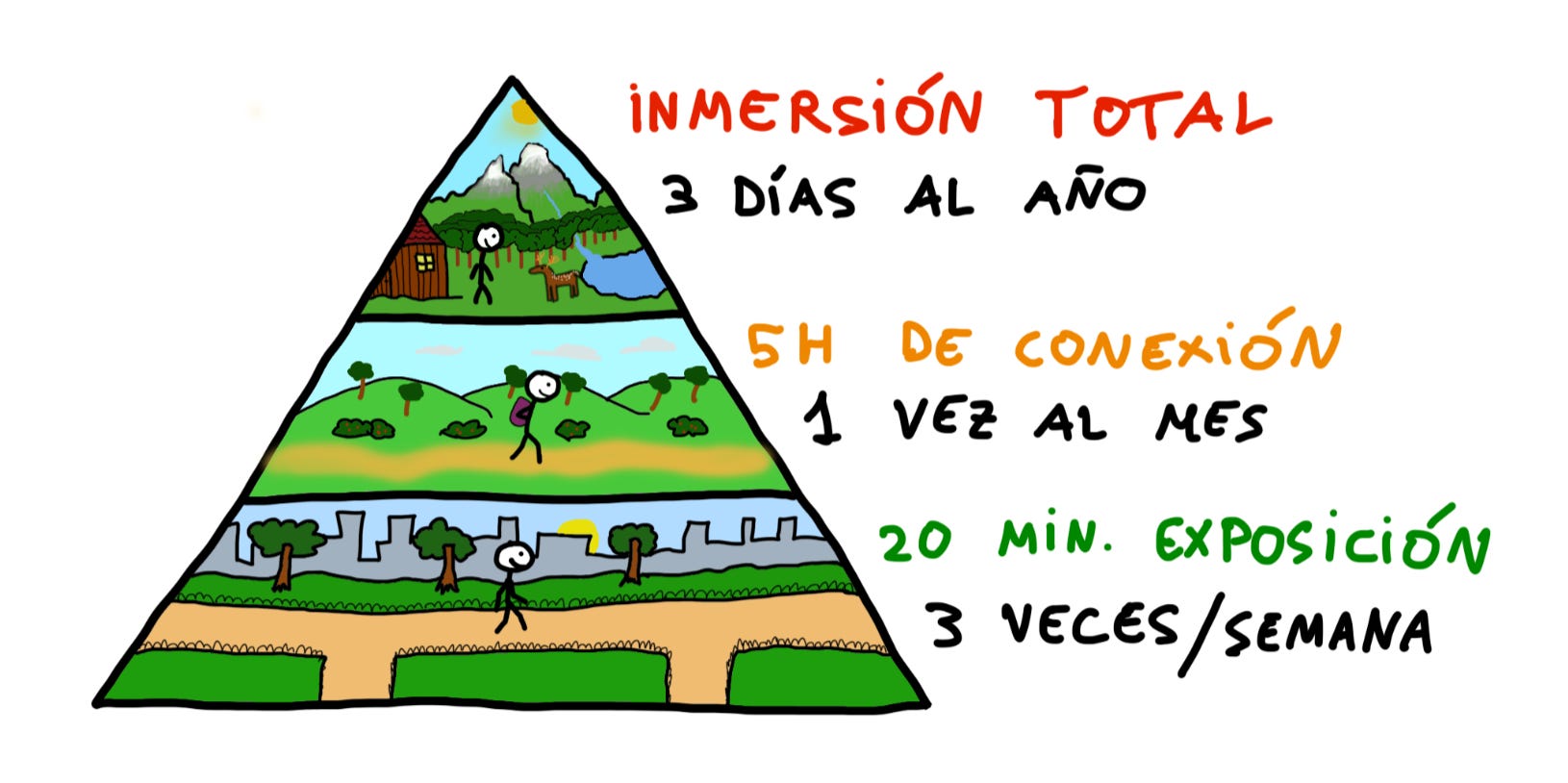 Mi recomendación es respetar la Pirámide de la Naturaleza (término que proviene de Tim Beatley). Esta pirámide básicamente recomienda un mínimo de tiempo en la naturaleza a distintas escalas.