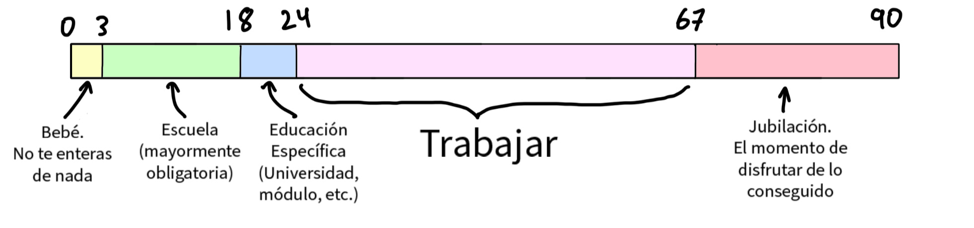 Ese camino correcto sigue un patrón establecido a partir de la revolución industrial y afianzado durante los siglos XIX y XX. Estudia, trabaja de 9 a 6 toda tu vida, jubilate y luego te mueres. Muy práctico para el estado si tienes que ensamblar piezas en una cadena de montaje, pero para el individuo tal vez no sea la mejor opción (y para el estado tampoco hoy en día...).