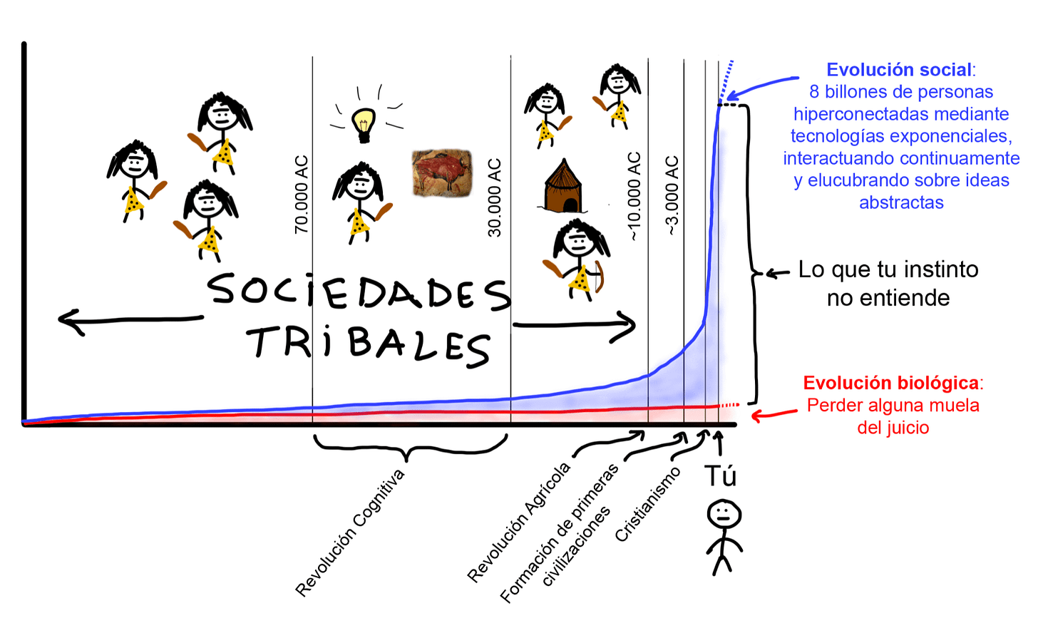 El problema es que la evolución social durante los últimos 10.000 años ha sido exponencial y nuestra evolución biológica no ha estado a la altura. Y esto no hace más que acrecentarse gracias a las nuevas tecnologías. Nuestra programación biológica (instinto) no está sincronizada con nuestra estructura social.